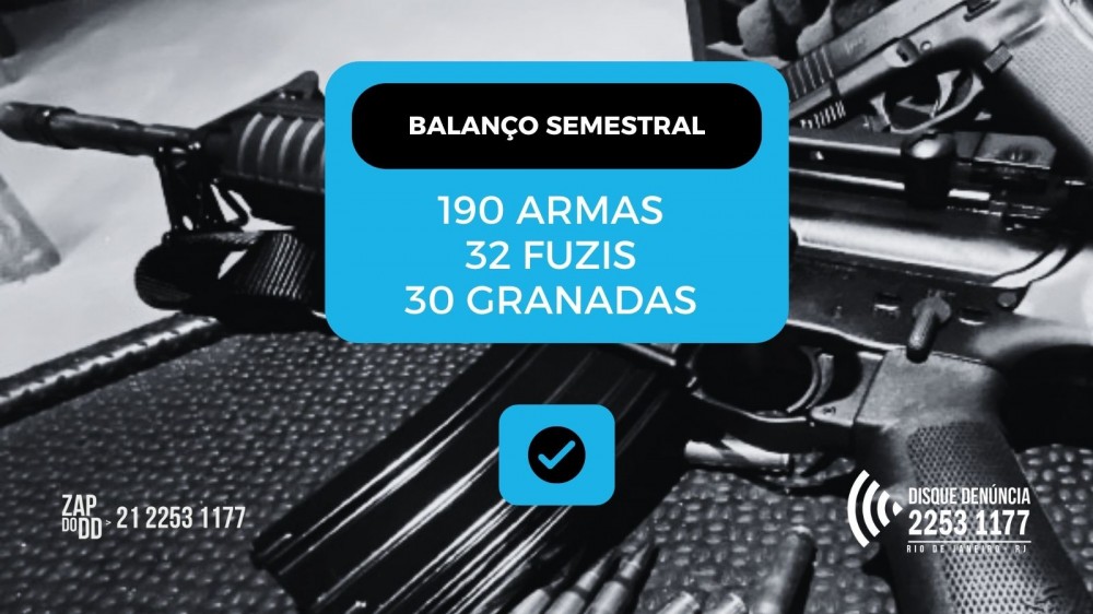 Entre os meses de janeiro e junho deste ano, o Disque Denúncia registrou 36.375 denúncias anônimas sobre atividades criminosas, em todo o estado do Rio de Janeiro. Importantes informações foram passadas para as Polícias e, com elas, foi possível a prisão de 445 criminosos, a apreensão de 32 fuzis, 190 pistolas e revólveres, 30 granadas e 2.593 munições para variados calibres.
